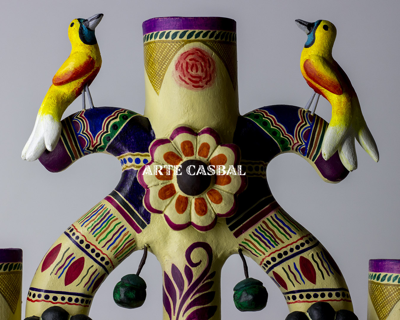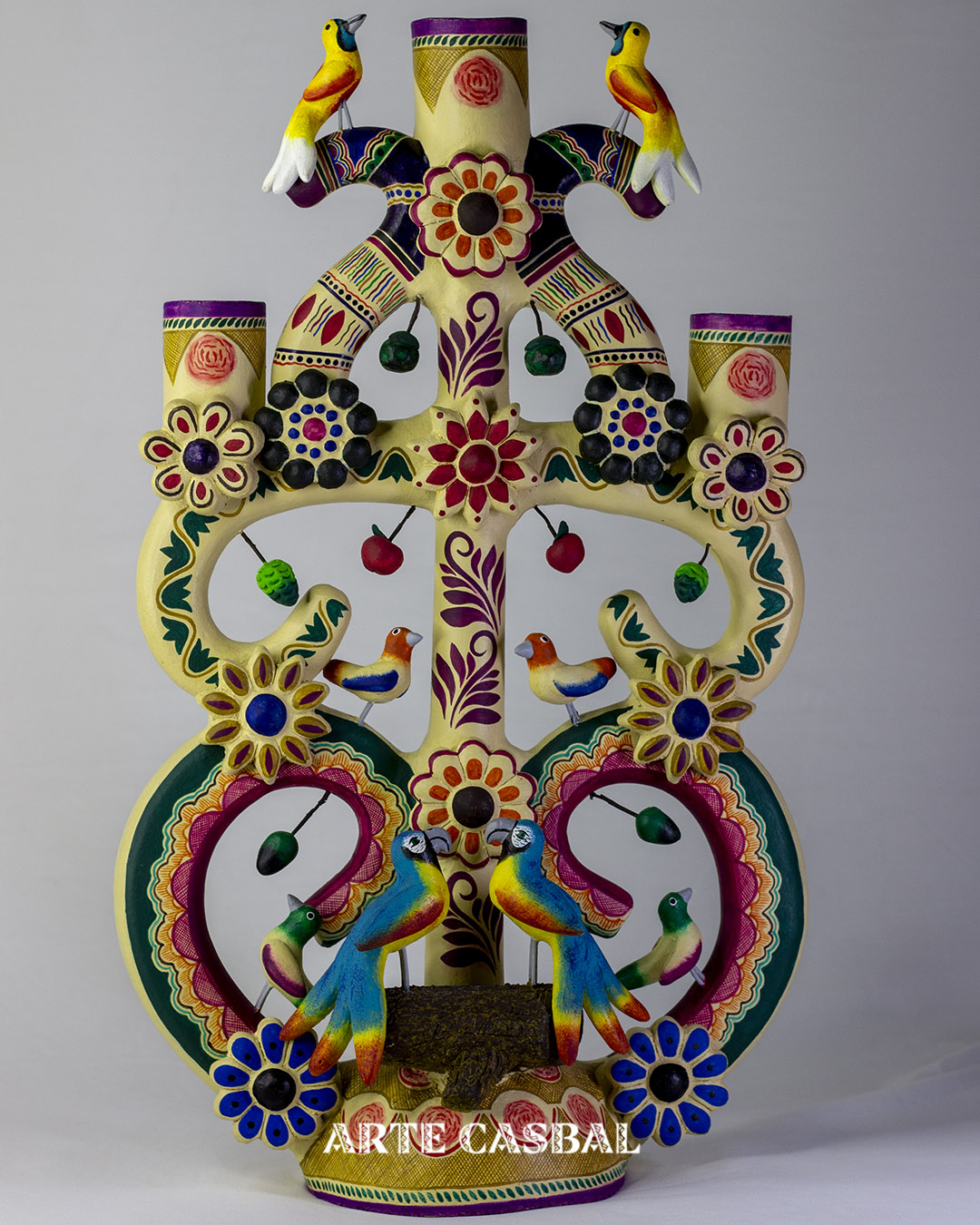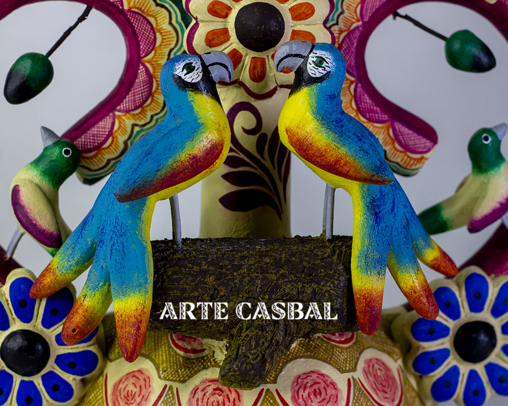 Etiquetas: arbol de la vida, barro policromado, candelabro, guacamayas
